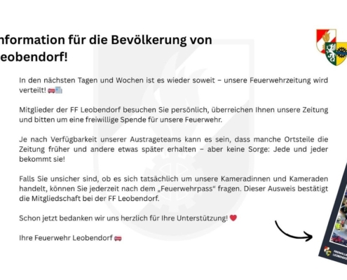 In den nächsten Tagen und Wochen sind Mitglieder der FF-Leobendorf unterwegs, um die Feuerwehrzeitung auszutragen.Nähere Infos lt. Anhang.