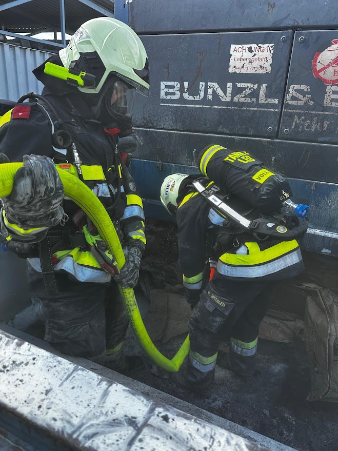 Der Atemschutztrupp räumte den angebrannten Teil des Containers aus und führte mittels C-Hohlstrahlrohr Nachlöscharbeiten durch.