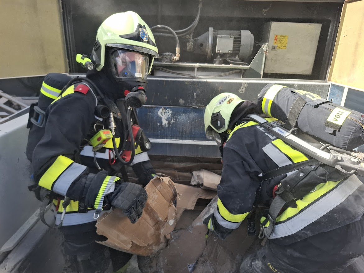 Am Einsatzort eingetroffen, fanden wir einen Karton-Presscontainer vor, in dem es zu einem Kleinbrand gekommen war. Durch erste Löschmaßnahmen durch Mitarbeiter der Firma konnte eine größere Brandausbreitung verhindert werden!