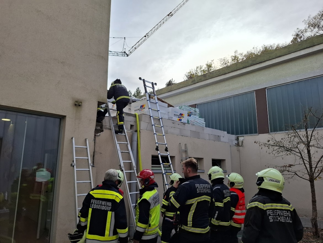 In Zusammenarbeit mit der ebenfalls alarmierten Feuerwehr Stockerau entfernten wir Teile der betroffenen Fassade und die Bitumendachbahn.