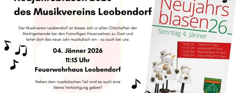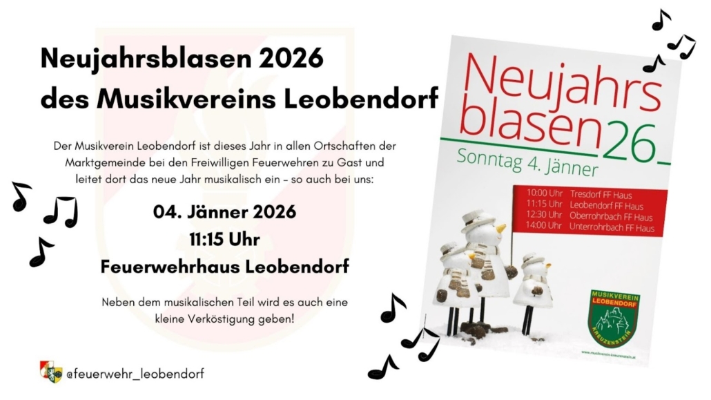 Neujahrsblasen 2026News …am 4. Jänner durch den Musikverein Leobendorf-Kreuzenstein.Station FF-Haus Leobendorf um 11:15 Uhr. 28.12.2025/von Tobias Weigl https://ff-leobendorf.at/wp-content/uploads/2025/12/NJB-2026.jpg 879 1563 Tobias Weigl https://ff-leobendorf.at/wp-content/uploads/2023/10/korpsabzeichen_leobendorf.svg Tobias Weigl2025-12-28 11:15:002025-12-28 13:24:49Neujahrsblasen 2026