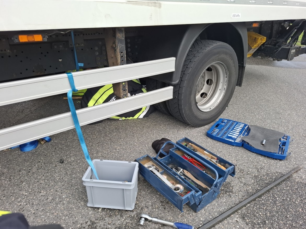 Mit ein paar kleineren Vorarbeiten und mittels Druckluft-Fremdversorgung konnten wir das Fahrzeug so positionieren, dass die Straße halbseitig wieder befahrbar war.