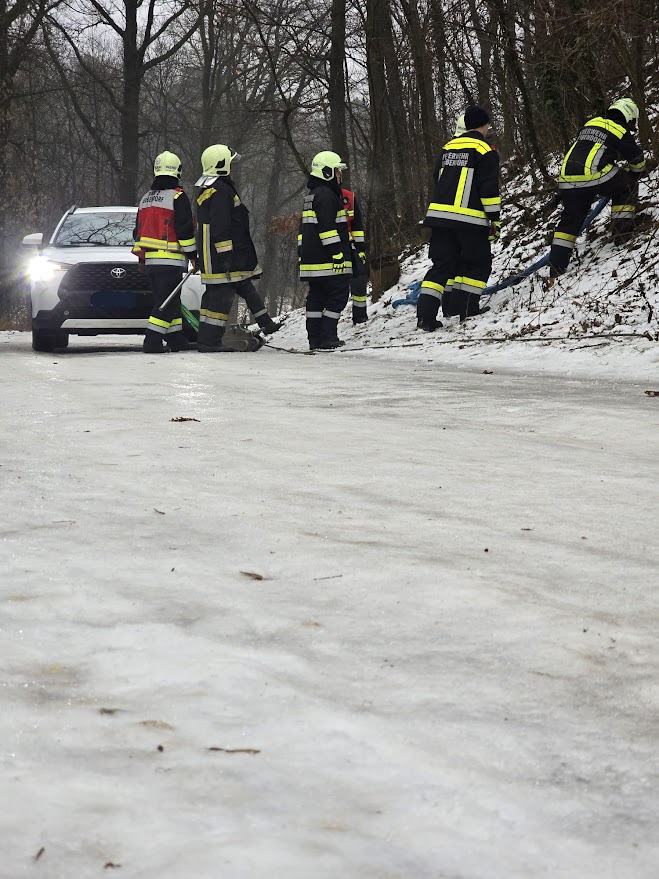 Nicht ortskundige Touristen fuhren die Straße vom Burgparkplatz Richtung Burg Kreuzenstein, da diese Straße nicht vom Winterdienst betreut wird kam das Fahrzeug auf dem planken Eis ins rutschen und blieb dann quer zur Straße hängen.